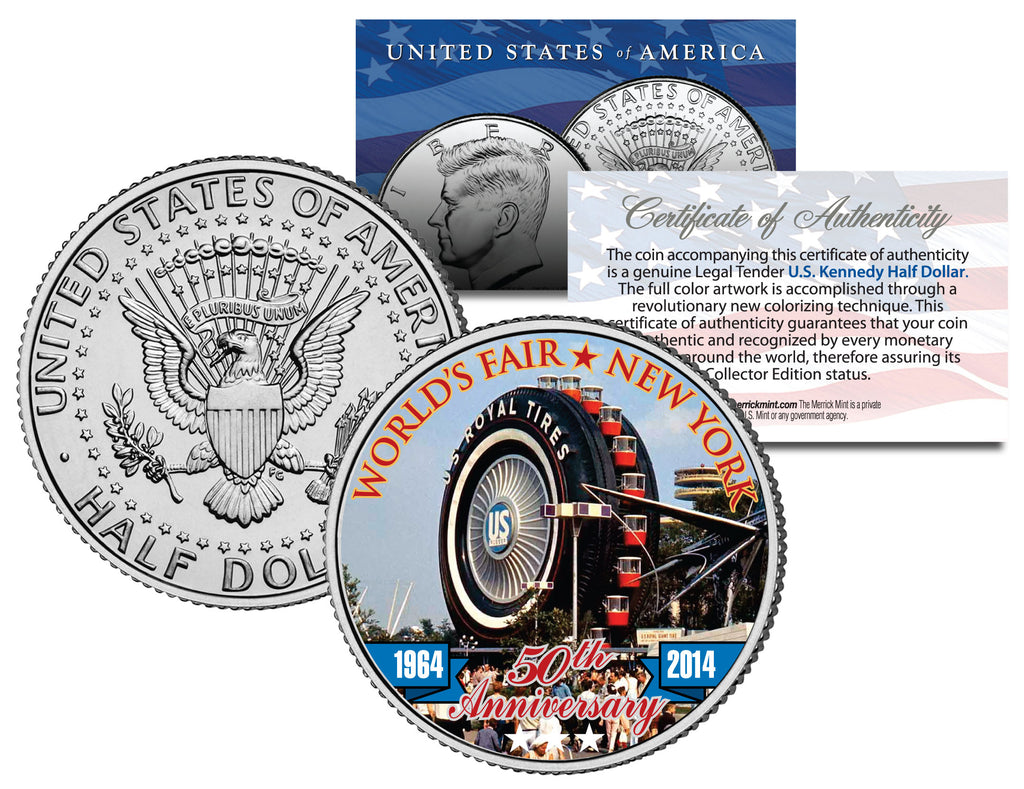 Here is your opportunity to own or gift the “NEW YORK WORLD’S FAIR – 1964-2014 - 50TH ANNIVERSARY - FERRIS WHEEL GIANT TIRE” colorized 2014 JFK Kennedy Half Dollar U.S. Coin, which has been enhanced with a beautifully colorized image by the Merrick Mint. Each coin comes in a premium coin capsule with a full color Certificate of Authenticity to guarantee that your coin is authentic and recognized by every monetary authority around the world. This Legal Tender United States coin has been colorized with an application of special inks directly to the surface of the coin, using a unique and painstakingly multicolor coin process, which achieves a level of detail, color saturation, and durability that is #1 in the coin industry. The result is an everlasting colorized coin collectible of ultra-high quality. The 2014 Kennedy half dollar is a U.S. fifty cent coin with mint marks chosen at random.