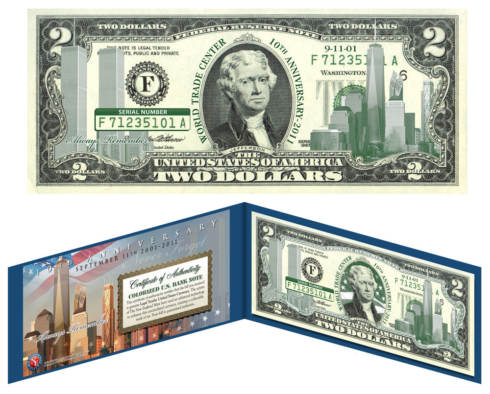 This WORLD TRADE CENTER 9/11 – 10th ANNIVERSARY uncirculated U.S. $2 Bill is Genuine Authentic Legal Tender of the United States, which has been enhanced with colorized images to NEVER FORGET the attack of the World Trade Center on September 11, 2001. The colorized images are accomplished through a revolutionary new authentic & genuine colorization process pioneered by The Merrick Mint, creating a collectible work of art. Each bill comes displayed in a blue folio with a Certificate of Authenticity to guarantee that your bills are authentic and recognized by every monetary authority around the world, therefore assuring its Collector Edition status. Each $2 Bill is in FRESH, CRISP, UNCIRCULATED condition, and was directly removed from untouched wrapped Federal Reserve sealed packs. Former U.S. President Thomas Jefferson is featured on the obverse of the note, along with the special colorization overlay. The Signing of the Declaration of Independence by John Trumbull is featured on the reverse. It is the only U.S. Currency note that features two Presidents, John Adams and Thomas Jefferson, and it is one of the most rarely seen BILLS in circulation and actual use.