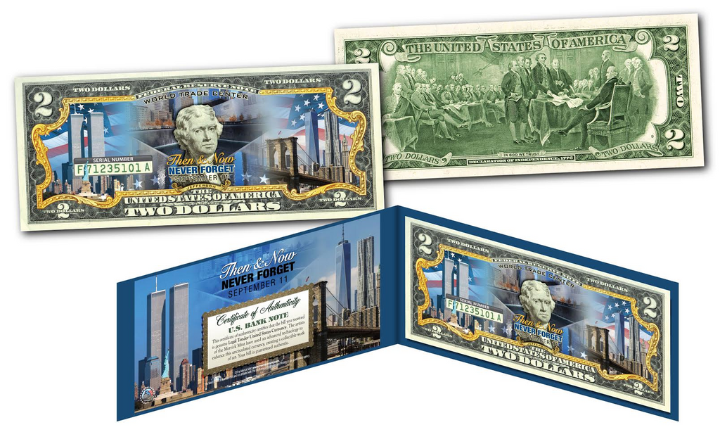 This uncirculated WORLD TRADE CENTER WTC 9/11 * Then and Now * $2 Bill is Genuine Authentic Legal Tender of the United States. The full colorized images are accomplished through a revolutionary new authentic & genuine colorization process pioneered by The Merrick Mint, creating a collectible work of art. Each bill comes displayed in a blue folio with a Certificate of Authenticity to guarantee that your bills are authentic and recognized by every monetary authority around the world, therefore assuring its Collector Edition status. Each $2 Bill is in FRESH, CRISP, UNCIRCULATED condition, and was directly removed from untouched wrapped Federal Reserve sealed packs. Former U.S. President Thomas Jefferson is featured on the obverse of the note, along with the special colorization overlay. The Signing of the Declaration of Independence by John Trumbull is featured on the reverse. It is the only U.S. Currency note that features two Presidents, John Adams and Thomas Jefferson, and it is one of the most rarely seen BILLS in circulation and actual use.