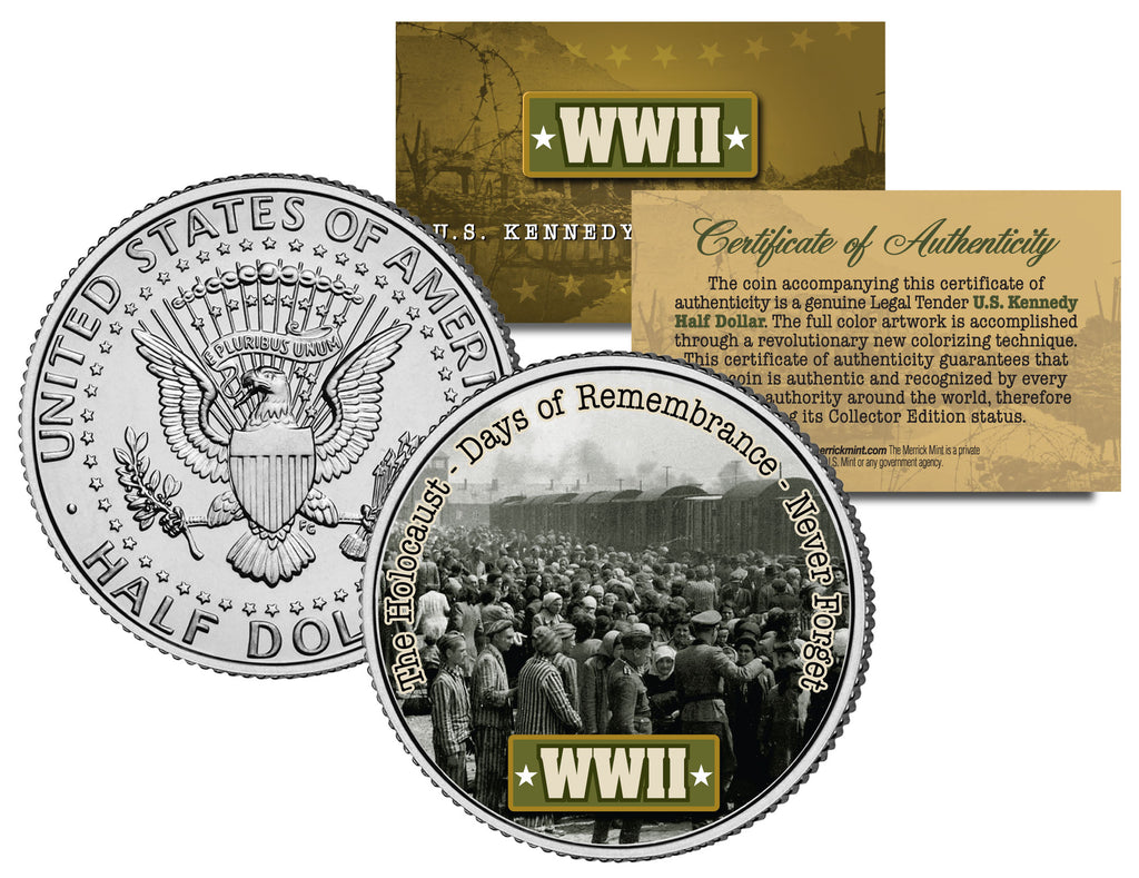 This is the WORLD WAR II SERIES – THE HOLOCAUST – DAYS OF REMEMBRANCE collectible coin. Here is your chance to own a beautifully colorized JFK Kennedy Half Dollar U.S. Coin. This high-quality genuine Legal Tender U.S. coin has been colorized using a unique painstaking multicolor authentic process by the Merrick Mint. Colorizing coins involves the unique application of special inks directly to the surface of a coin that achieves a level of detail, color saturation, and durability that is #1 in the coin industry. The result is an everlasting colorized coin collectible of ultra-high quality. Each coin comes in a premium coin capsule with a Certificate of Authenticity to guaranty that your coin is authentic and recognized by every monetary authority around the world, assuring its Collector Edition status. The Kennedy half dollar is a U.S. fifty cent coin with coin year and mint marks chosen at random. The Holocaust was the mass murder or genocide of approximately six million Jews during World War II.