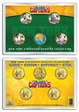 Here is your chance to own a complete set of five (5) 24KT Gold Plated and colorized 2001 New York Statehood Quarters U.S. Coins featuring the NEW YORK YANKEES GREATEST CAPTAINS, in this Limited Edition Coin Series. The 5-coin set includes: Lou Gehrig, Thurman Munson, Don Mattingly, Derek Jeter, plus a reverse colorized NY State quarter. These high-quality, genuine Legal Tender United States coins have been layered in Genuine 24 Karat Gold, and then colorized using a unique painstaking multicolor authentic process by the Merrick Mint. Colorizing coins involves the unique application of special inks directly to the surface of a coin that achieves a level of detail, color saturation, and durability that is #1 in the coin industry. The result is an everlasting colorized coin collectible of ultra-high quality. Each 24KT Gold Plated coin features an emblematic design of New York state on the reverse and portrait of George Washington design on the obverse. Coins come displayed on a die-cut display with beautiful artwork sealed in a 4” x 6” acrylic airtight case. REGULAR PRICE of these 5-coins is $40.00. GREAT SAVINGS BY BUYING HERE NOW!!!