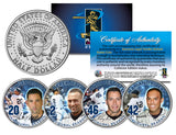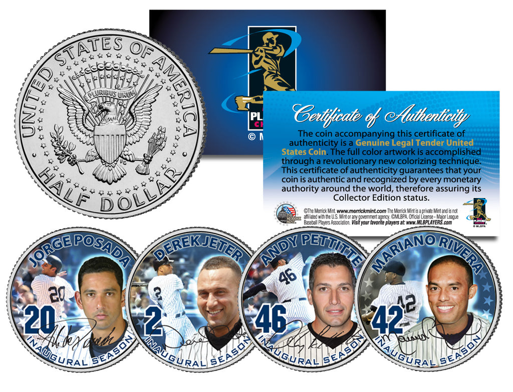 Here is your chance to own a complete set of four (4) colorized JFK Kennedy Half Dollar U.S. Coins featuring the YANKEES CORE FOUR, in this Limited Edition 2009 Yankee Stadium Inaugural Season Coin Series. The 4-coin set includes: Jorge Posada, Derek Jeter, Andy Pettitte, Mariano Rivera. These high-quality, genuine Legal Tender United States coins have been colorized using a unique painstaking multicolor authentic process by the Merrick Mint. Colorizing coins involves the unique application of special inks directly to the surface of a coin that achieves a level of detail, color saturation, and durability that is #1 in the coin industry. The result is an everlasting colorized coin collectible of ultra-high quality. Each coin comes in a premium coin capsule. The 4-coin set comes with a Certificate of Authenticity to guarantee that your coins are authentic and recognized by every monetary authority around the world, assuring its Collector Edition status. The Kennedy half dollar is a U.S. fifty cent coin with coin year and mint marks chosen at random.