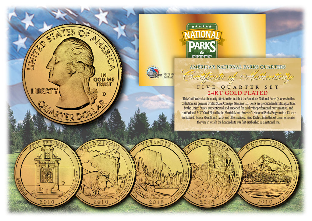 2010 America The Beautiful 24K GOLD PLATED Quarters U.S. Parks 5-Coin Set with Capsules