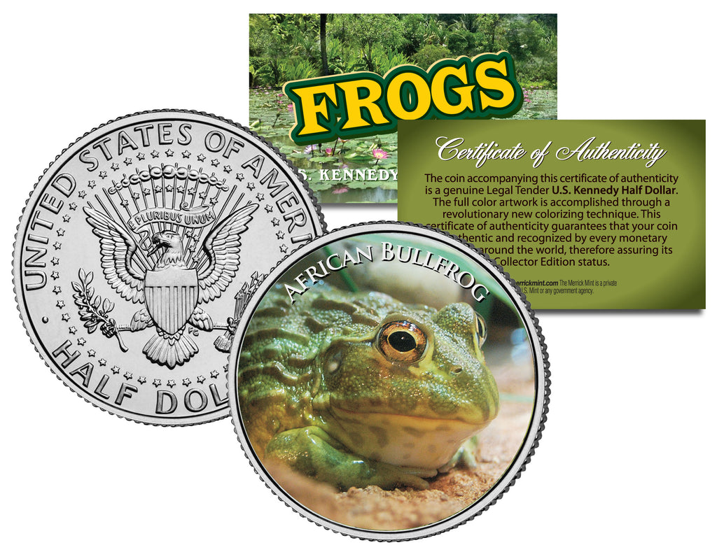 This COLLECTIBLE FROGS SERIES – AFRICAN BULLFROG coin is a treasured collectible, combining the popularity of frog collecting with coin collecting. Here is your chance to own a beautifully colorized JFK Kennedy Half Dollar U.S. Coin. This high-quality genuine Legal Tender U.S. coin has been colorized using a unique painstaking multicolor authentic process. Colorizing coins involves the unique application of special inks directly to the surface of a coin that achieves a level of detail, color saturation, and durability that is #1 in the coin industry. The result is an everlasting colorized coin collectible of ultra-high quality. Each coin comes in a premium coin capsule with a Certificate of Authenticity.
