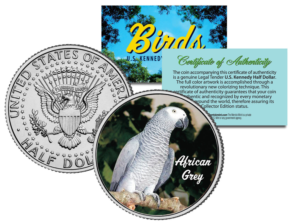 This COLLECTIBLE BIRDS SERIES – AFRICAN GREY coin is a treasured collectible, combining the popularity of birds with coin collecting. Here is your chance to own a beautifully colorized JFK Kennedy Half Dollar U.S. Coin. This high-quality genuine Legal Tender U.S. coin has been colorized using a unique painstaking multicolor authentic process by the Merrick Mint. Colorizing coins involves the unique application of special inks directly to the surface of a coin that achieves a level of detail, color saturation, and durability that is #1 in the coin industry. The result is an everlasting colorized coin collectible of ultra-high quality. Each coin comes in a premium coin capsule with a Certificate of Authenticity to guaranty that your coin is authentic and recognized by every monetary authority around the world, assuring its Collector Edition status. The Kennedy half dollar is a U.S. fifty cent coin with coin year and mint marks chosen at random.