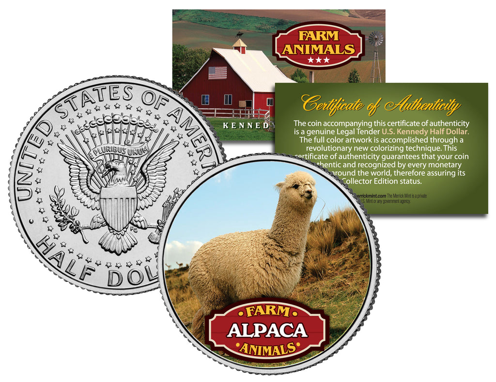 This COLLECTIBLE FARM ANIMALS SERIES – ALPACA coin is a treasured collectible, combining the popularity of Farm Animals with coin collecting. Here is your chance to own a beautifully colorized JFK Kennedy Half Dollar U.S. Coin. This high-quality genuine Legal Tender U.S. coin has been colorized using a unique painstaking multicolor authentic process. Colorizing coins involves the unique application of special inks directly to the surface of a coin that achieves a level of detail, color saturation, and durability that is #1 in the coin industry. The result is an everlasting colorized coin collectible of ultra-high quality. Each coin comes in a premium coin capsule with a Certificate of Authenticity to guaranty that your coin is authentic and recognized by every monetary authority around the world, assuring its Collector Edition status. An alpaca is a domesticated species of South American camelid. Within the United States, alpacas are used for their fiber material, fleece.