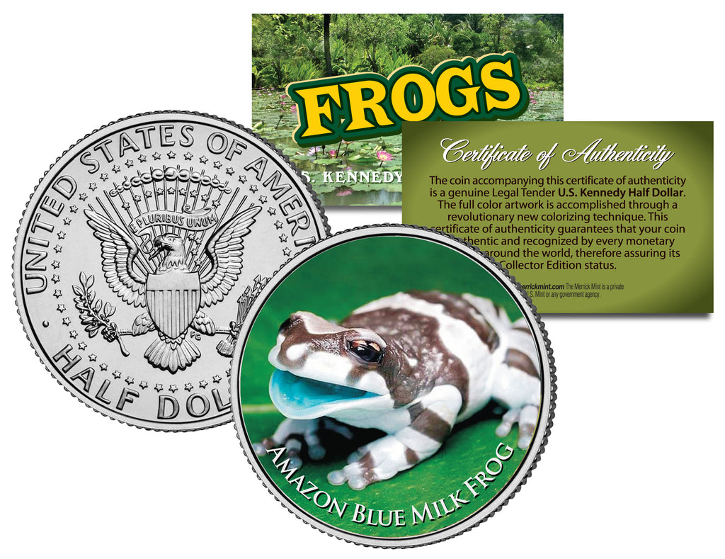 This COLLECTIBLE FROGS SERIES – AMAZON BLUE MILK FROG coin is a treasured collectible, combining the popularity of frog collecting with coin collecting. Here is your chance to own a beautifully colorized JFK Kennedy Half Dollar U.S. Coin. This high-quality genuine Legal Tender U.S. coin has been colorized using a unique painstaking multicolor authentic process. Colorizing coins involves the unique application of special inks directly to the surface of a coin that achieves a level of detail, color saturation, and durability that is #1 in the coin industry. The result is an everlasting colorized coin collectible of ultra-high quality. Each coin comes in a premium coin capsule with a Certificate of Authenticity.