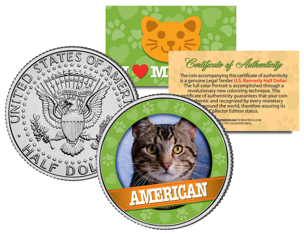 This CAT SERIES coin is a treasured collectible, combining the popularity of dogs with coin collecting. Here is your chance to own a beautifully colorized JFK Kennedy Half Dollar U.S. Coin. This high-quality genuine Legal Tender U.S. coin has been colorized using a unique painstaking multicolor authentic process. Colorizing coins involves the unique application of special inks directly to the surface of a coin that achieves a level of detail, color saturation, and durability that is #1 in the coin industry. The result is an everlasting colorized coin collectible of ultra-high quality. Each coin comes in a premium coin capsule with a Certificate of Authenticity