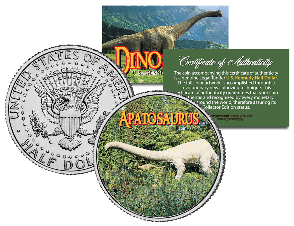 This COLLECTIBLE DINOSAURS SERIES – APATOSAURUS coin is a treasured collectible, combining the popularity of dinosaurs with coin collecting. Here is your chance to own a beautifully colorized JFK Kennedy Half Dollar U.S. Coin. This high-quality genuine Legal Tender U.S. coin has been colorized using a unique painstaking multicolor authentic process. Colorizing coins involves the unique application of special inks directly to the surface of a coin that achieves a level of detail, color saturation, and durability that is #1 in the coin industry. The result is an everlasting colorized coin collectible of ultra-high quality. Each coin comes in a premium coin capsule with a Certificate of Authenticity to guaranty that your coin is authentic and recognized by every monetary authority around the world, assuring its Collector Edition status. Apatosaurus (a.k.a., Brontosaurus) is a genus of sauropod dinosaur that lived from about 154 to 150 million years ago, during the Jurassic Period.