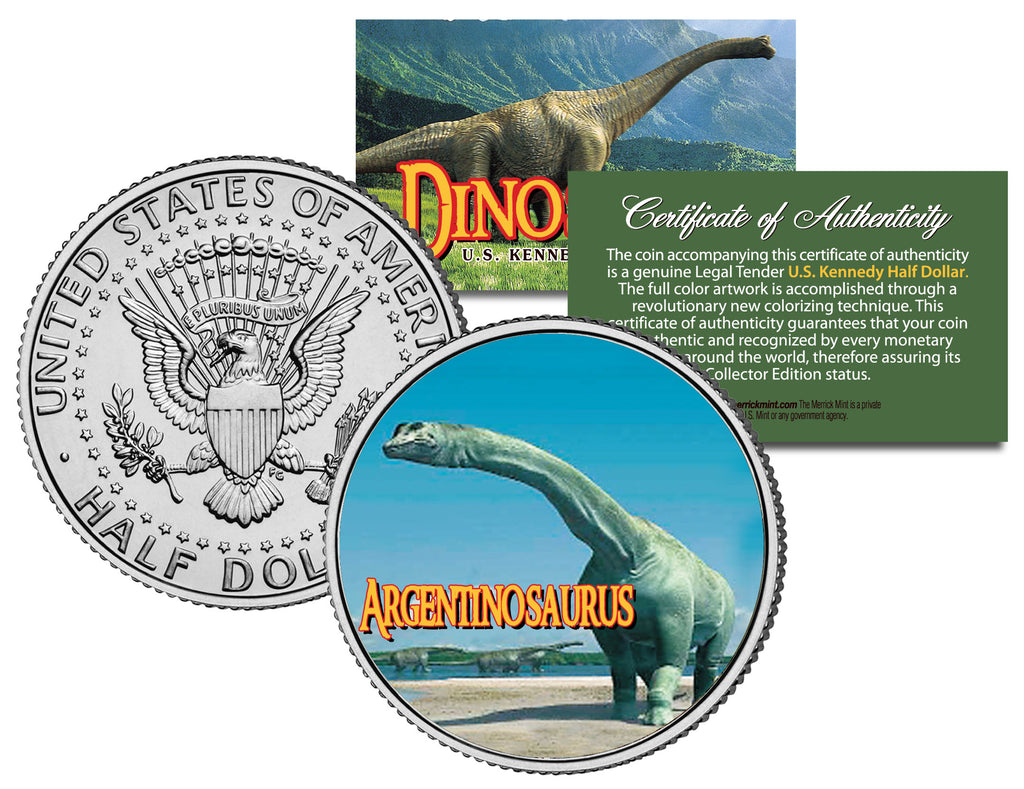 This COLLECTIBLE DINOSAURS SERIES – ARGENTINOSAURUS coin is a treasured collectible, combining the popularity of dinosaurs with coin collecting. Here is your chance to own a beautifully colorized JFK Kennedy Half Dollar U.S. Coin. This high-quality genuine Legal Tender U.S. coin has been colorized using a unique painstaking multicolor authentic process. Colorizing coins involves the unique application of special inks directly to the surface of a coin that achieves a level of detail, color saturation, and durability that is #1 in the coin industry. The result is an everlasting colorized coin collectible of ultra-high quality. Each coin comes in a premium coin capsule with a Certificate of Authenticity to guaranty that your coin is authentic and recognized by every monetary authority around the world, assuring its Collector Edition status. Argentinosaurus is a genus of titanosaur sauropod dinosaur first discovered by Guillermo Heredia in Argentina.