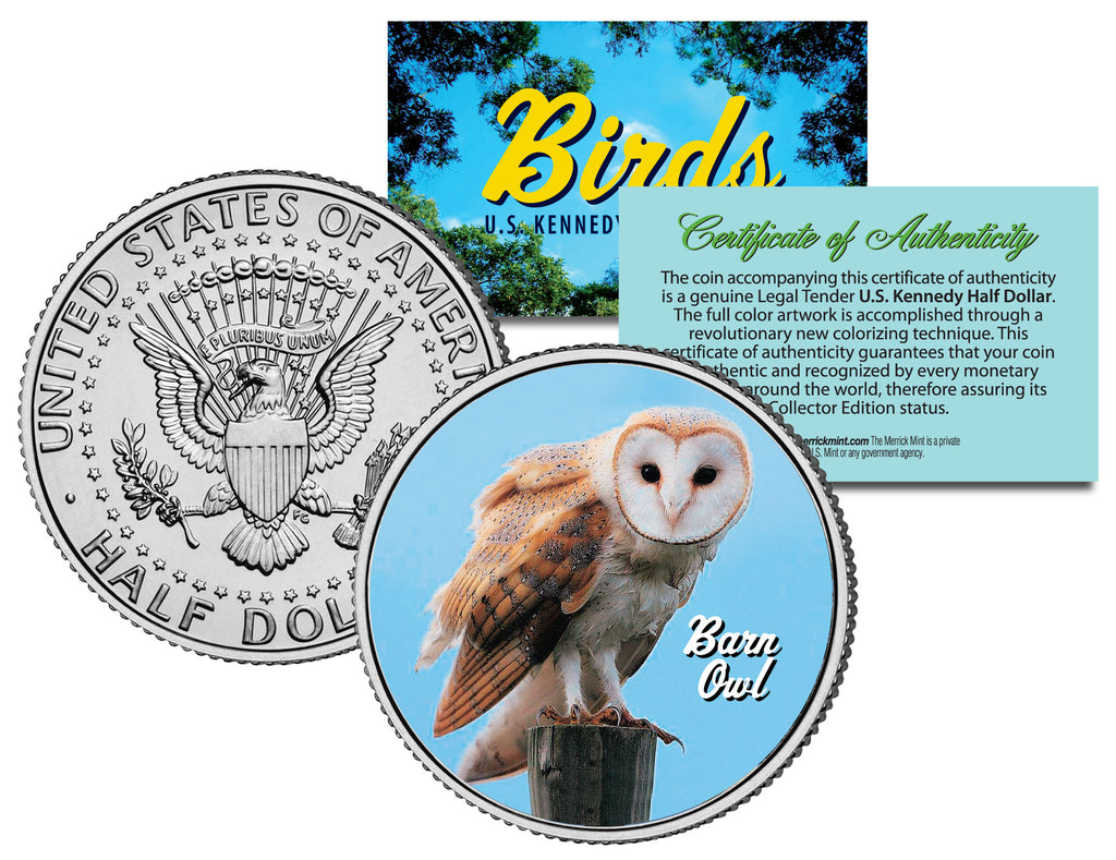 This COLLECTIBLE BIRDS SERIES – BARN OWL coin is a treasured collectible, combining the popularity of birds with coin collecting. Here is your chance to own a beautifully colorized JFK Kennedy Half Dollar U.S. Coin. This high-quality genuine Legal Tender U.S. coin has been colorized using a unique painstaking multicolor authentic process by the Merrick Mint. Colorizing coins involves the unique application of special inks directly to the surface of a coin that achieves a level of detail, color saturation, and durability that is #1 in the coin industry. The result is an everlasting colorized coin collectible of ultra-high quality. Each coin comes in a premium coin capsule with a Certificate of Authenticity to guaranty that your coin is authentic and recognized by every monetary authority around the world, assuring its Collector Edition status. The Kennedy half dollar is a U.S. fifty cent coin with coin year and mint marks chosen at random.