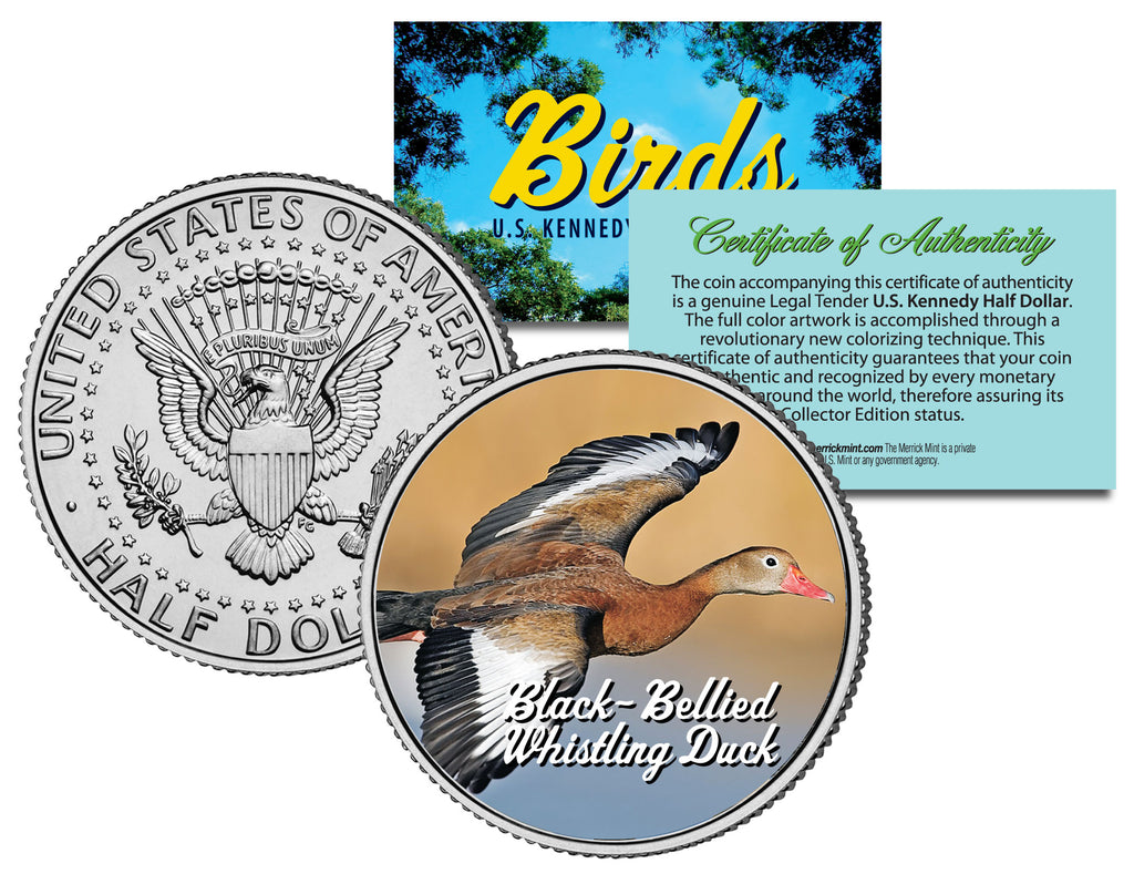 This COLLECTIBLE BIRDS SERIES – BLACK-BELLIED WHISTLING DUCK coin is a treasured collectible, combining the popularity of birds with coin collecting. Here is your chance to own a beautifully colorized JFK Kennedy Half Dollar U.S. Coin. This high-quality genuine Legal Tender U.S. coin has been colorized using a unique painstaking multicolor authentic process by the Merrick Mint. Colorizing coins involves the unique application of special inks directly to the surface of a coin that achieves a level of detail, color saturation, and durability that is #1 in the coin industry. The result is an everlasting colorized coin collectible of ultra-high quality. Each coin comes in a premium coin capsule with a Certificate of Authenticity to guaranty that your coin is authentic and recognized by every monetary authority around the world, assuring its Collector Edition status. The Kennedy half dollar is a U.S. fifty cent coin with coin year and mint marks chosen at random.