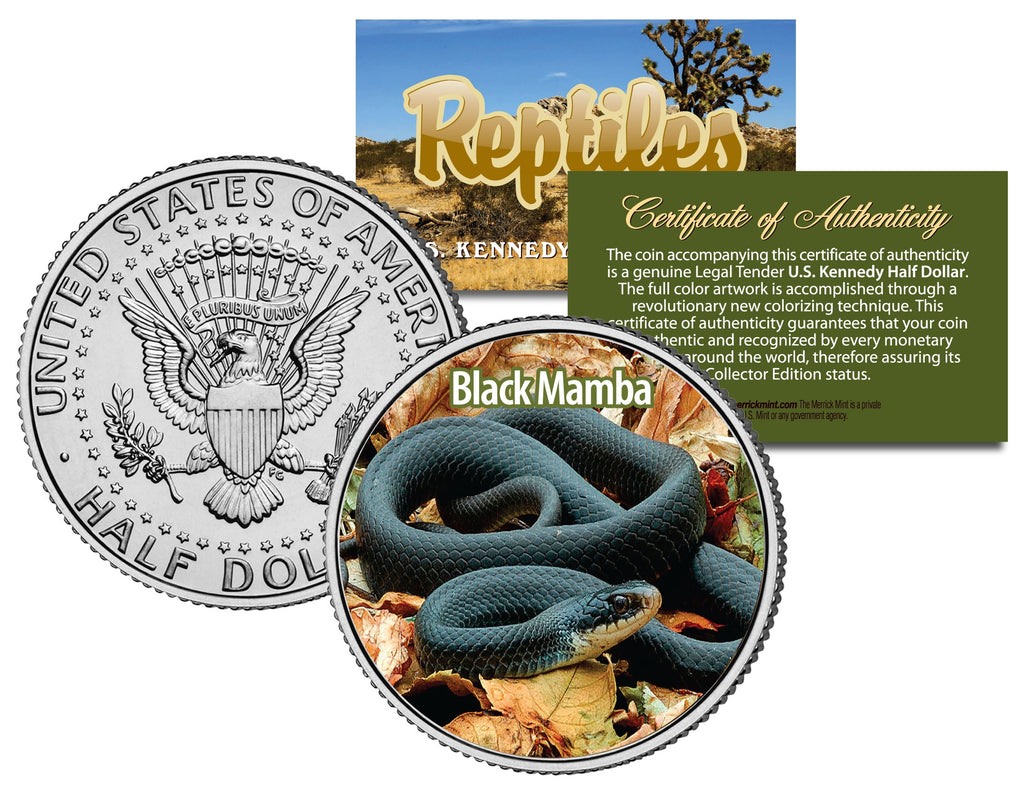 This COLLECTIBLE REPTILES SERIES – BLACK MAMBA coin is a treasured collectible, combining the popularity of reptiles with coin collecting. Here is your chance to own a beautifully colorized JFK Kennedy Half Dollar U.S. Coin. This high-quality genuine Legal Tender U.S. coin has been colorized using a unique painstaking multicolor authentic process. Colorizing coins involves the unique application of special inks directly to the surface of a coin that achieves a level of detail, color saturation, and durability that is #1 in the coin industry. The result is an everlasting colorized coin collectible of ultra-high quality. Each coin comes in a premium coin capsule with a Certificate of Authenticity.
