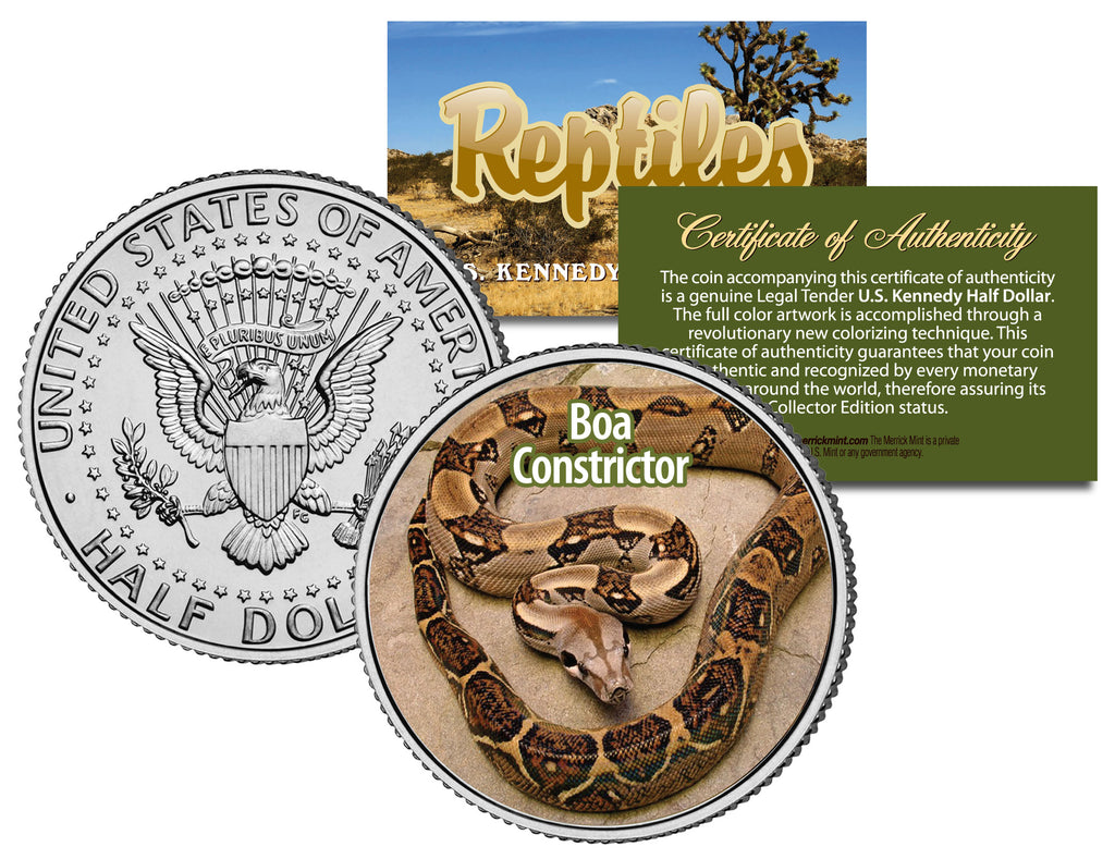 This COLLECTIBLE REPTILES SERIES – BOA CONSTRICTOR coin is a treasured collectible, combining the popularity of reptiles with coin collecting. Here is your chance to own a beautifully colorized JFK Kennedy Half Dollar U.S. Coin. This high-quality genuine Legal Tender U.S. coin has been colorized using a unique painstaking multicolor authentic process. Colorizing coins involves the unique application of special inks directly to the surface of a coin that achieves a level of detail, color saturation, and durability that is #1 in the coin industry. The result is an everlasting colorized coin collectible of ultra-high quality. Each coin comes in a premium coin capsule with a Certificate of Authenticity.