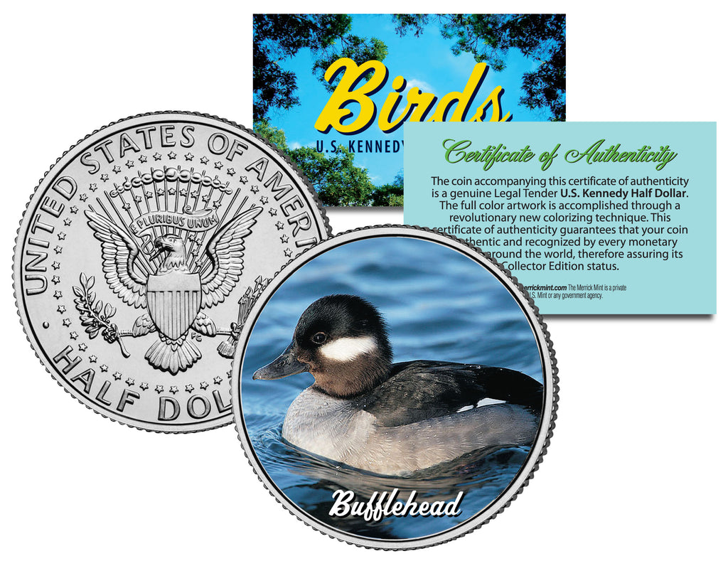 This COLLECTIBLE BIRDS SERIES – BUFFLEHEAD coin is a treasured collectible, combining the popularity of birds with coin collecting. Here is your chance to own a beautifully colorized JFK Kennedy Half Dollar U.S. Coin. This high-quality genuine Legal Tender U.S. coin has been colorized using a unique painstaking multicolor authentic process by the Merrick Mint. Colorizing coins involves the unique application of special inks directly to the surface of a coin that achieves a level of detail, color saturation, and durability that is #1 in the coin industry. The result is an everlasting colorized coin collectible of ultra-high quality. Each coin comes in a premium coin capsule with a Certificate of Authenticity to guaranty that your coin is authentic and recognized by every monetary authority around the world, assuring its Collector Edition status. The Kennedy half dollar is a U.S. fifty cent coin with coin year and mint marks chosen at random.