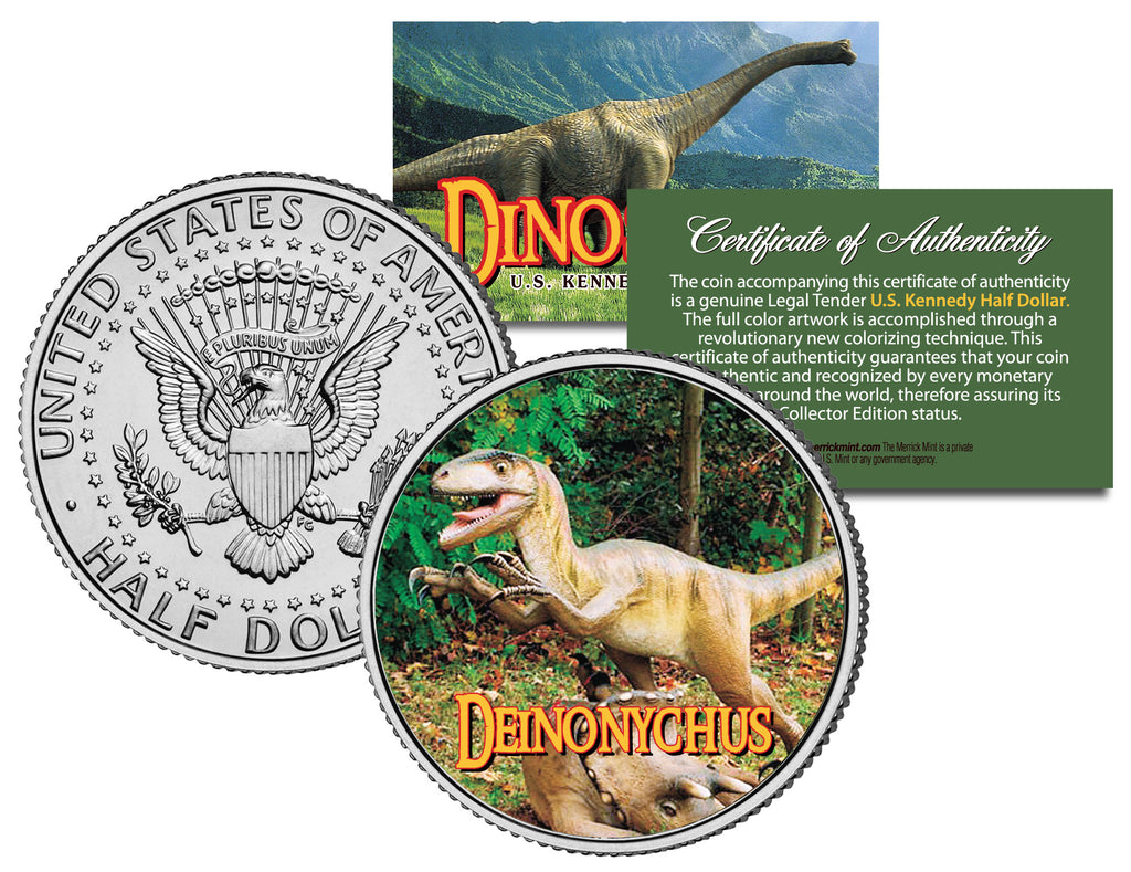 This COLLECTIBLE DINOSAURS SERIES – DEINONYCHUS coin is a treasured collectible, combining the popularity of dinosaurs with coin collecting. Here is your chance to own a beautifully colorized JFK Kennedy Half Dollar U.S. Coin. This high-quality genuine Legal Tender U.S. coin has been colorized using a unique painstaking multicolor authentic process. Colorizing coins involves the unique application of special inks directly to the surface of a coin that achieves a level of detail, color saturation, and durability that is #1 in the coin industry. The result is an everlasting colorized coin collectible of ultra-high quality. Each coin comes in a premium coin capsule with a Certificate of Authenticity to guaranty that your coin is authentic and recognized by every monetary authority around the world, assuring its Collector Edition status. Deinonychus is a genus of carnivorous dromaeosaurid dinosaurs that lived during the early Cretaceous Period, about 115–108 million years ago.