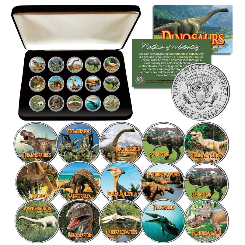 Here is your chance to own a beautifully colorized DINOSAUR Complete 15-coin JFK Kennedy Half Dollar U.S. Coin Collection. These high-quality genuine Legal Tender U.S. coins have been colorized using a unique painstaking multi-color authentic process. Colorizing coins involves the unique application of special inks directly to the surface of a coin that achieves a level of detail, color saturation, and durability that is #1 in the coin industry. The result is an everlasting colorized coin collectible of ultra-high quality. Each coin comes in a premium coin capsule. Each set comes with a deluxe black felt coin display metal gift box. The 15-coin set comes with a Certificate of Authenticity to guarantee that your coins are authentic and recognized by every monetary authority around the world, assuring its Collector Edition status.