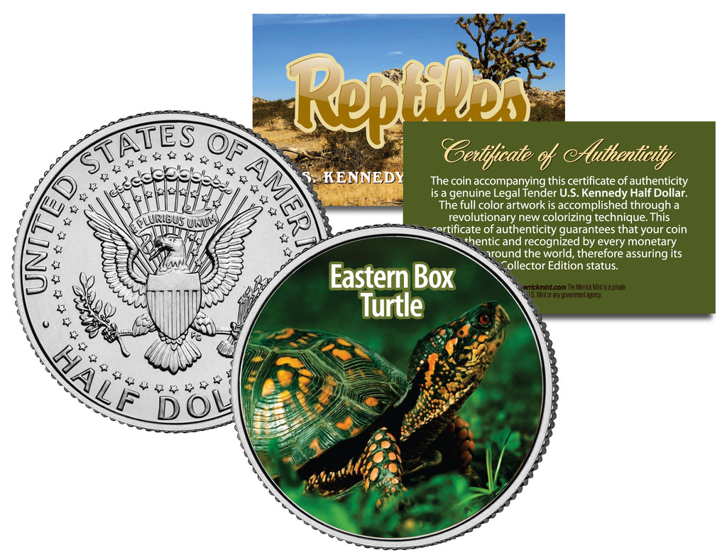 This COLLECTIBLE REPTILES SERIES – EASTERN BOX TURTLE coin is a treasured collectible, combining the popularity of reptiles with coin collecting. Here is your chance to own a beautifully colorized JFK Kennedy Half Dollar U.S. Coin. This high-quality genuine Legal Tender U.S. coin has been colorized using a unique painstaking multicolor authentic process. Colorizing coins involves the unique application of special inks directly to the surface of a coin that achieves a level of detail, color saturation, and durability that is #1 in the coin industry. The result is an everlasting colorized coin collectible of ultra-high quality. Each coin comes in a premium coin capsule with a Certificate of Authenticity.