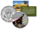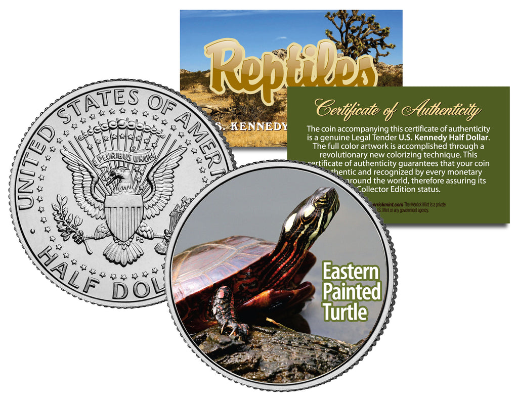 This COLLECTIBLE REPTILES SERIES – EASTERN PAINTED TURTLE coin is a treasured collectible, combining the popularity of reptiles with coin collecting. Here is your chance to own a beautifully colorized JFK Kennedy Half Dollar U.S. Coin. This high-quality genuine Legal Tender U.S. coin has been colorized using a unique painstaking multicolor authentic process. Colorizing coins involves the unique application of special inks directly to the surface of a coin that achieves a level of detail, color saturation, and durability that is #1 in the coin industry. The result is an everlasting colorized coin collectible of ultra-high quality. Each coin comes in a premium coin capsule with a Certificate of Authenticity.
