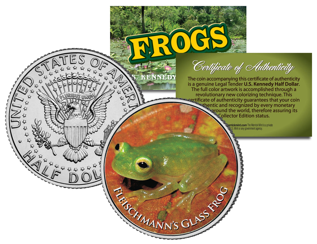 This COLLECTIBLE FROGS SERIES – FLEISCHMANN'S GLASS FROG coin is a treasured collectible, combining the popularity of frog collecting with coin collecting. Here is your chance to own a beautifully colorized JFK Kennedy Half Dollar U.S. Coin. This high-quality genuine Legal Tender U.S. coin has been colorized using a unique painstaking multicolor authentic process. Colorizing coins involves the unique application of special inks directly to the surface of a coin that achieves a level of detail, color saturation, and durability that is #1 in the coin industry. The result is an everlasting colorized coin collectible of ultra-high quality. Each coin comes in a premium coin capsule with a Certificate of Authenticity.
