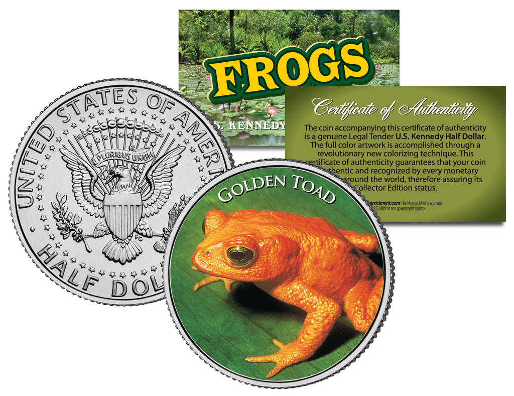 This COLLECTIBLE FROGS SERIES – GOLDEN TOAD coin is a treasured collectible, combining the popularity of frog collecting with coin collecting. Here is your chance to own a beautifully colorized JFK Kennedy Half Dollar U.S. Coin. This high-quality genuine Legal Tender U.S. coin has been colorized using a unique painstaking multicolor authentic process. Colorizing coins involves the unique application of special inks directly to the surface of a coin that achieves a level of detail, color saturation, and durability that is #1 in the coin industry. The result is an everlasting colorized coin collectible of ultra-high quality. Each coin comes in a premium coin capsule with a Certificate of Authenticity.