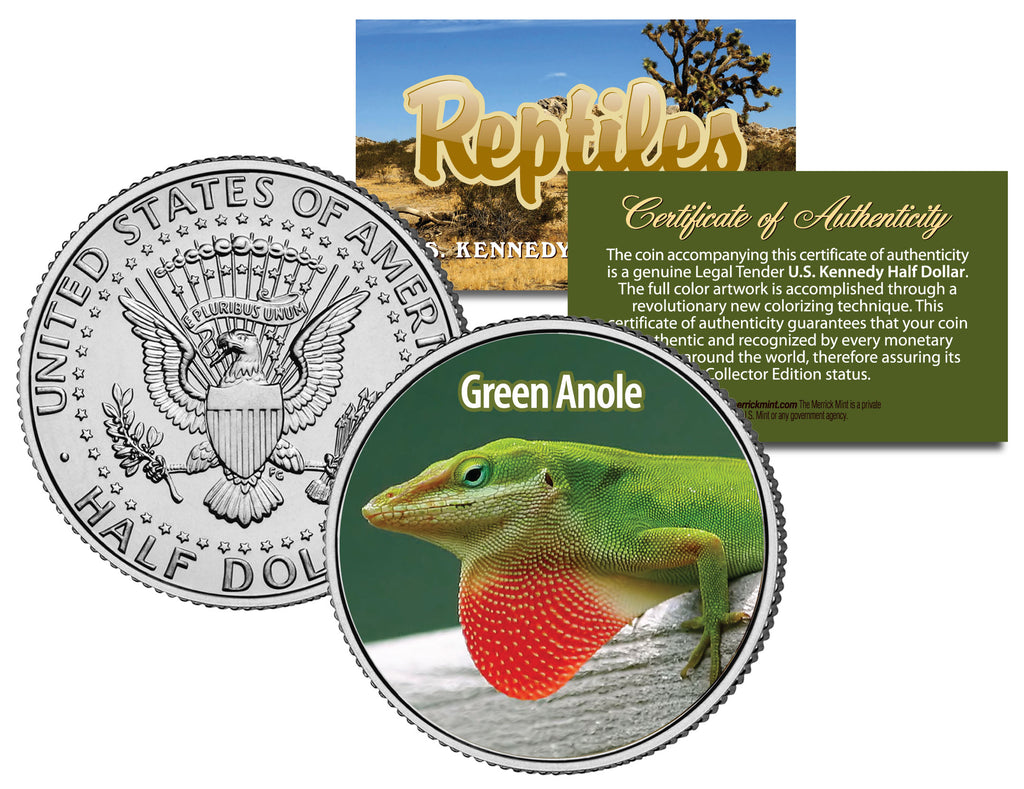 This COLLECTIBLE REPTILES SERIES – GREEN ANOLE coin is a treasured collectible, combining the popularity of reptiles with coin collecting. Here is your chance to own a beautifully colorized JFK Kennedy Half Dollar U.S. Coin. This high-quality genuine Legal Tender U.S. coin has been colorized using a unique painstaking multicolor authentic process. Colorizing coins involves the unique application of special inks directly to the surface of a coin that achieves a level of detail, color saturation, and durability that is #1 in the coin industry. The result is an everlasting colorized coin collectible of ultra-high quality. Each coin comes in a premium coin capsule with a Certificate of Authenticity.