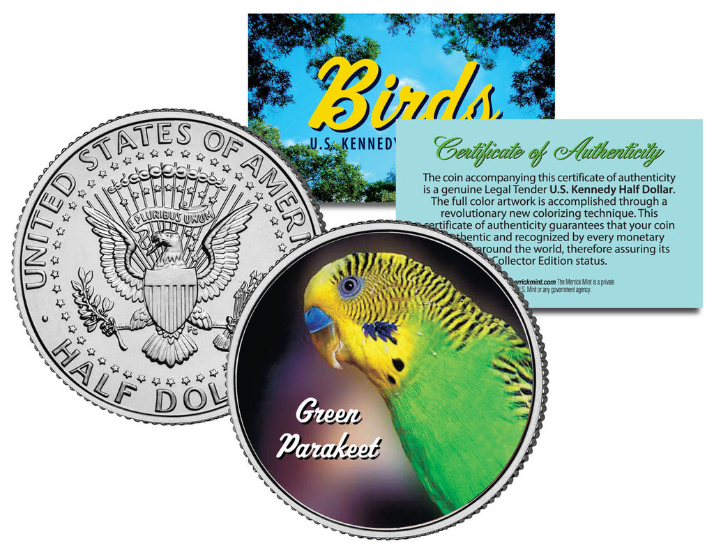 This COLLECTIBLE BIRDS SERIES – GREEN PARAKEET coin is a treasured collectible, combining the popularity of birds with coin collecting. Here is your chance to own a beautifully colorized JFK Kennedy Half Dollar U.S. Coin. This high-quality genuine Legal Tender U.S. coin has been colorized using a unique painstaking multicolor authentic process by the Merrick Mint. Colorizing coins involves the unique application of special inks directly to the surface of a coin that achieves a level of detail, color saturation, and durability that is #1 in the coin industry. The result is an everlasting colorized coin collectible of ultra-high quality. Each coin comes in a premium coin capsule with a Certificate of Authenticity to guaranty that your coin is authentic and recognized by every monetary authority around the world, assuring its Collector Edition status. The Kennedy half dollar is a U.S. fifty cent coin with coin year and mint marks chosen at random.