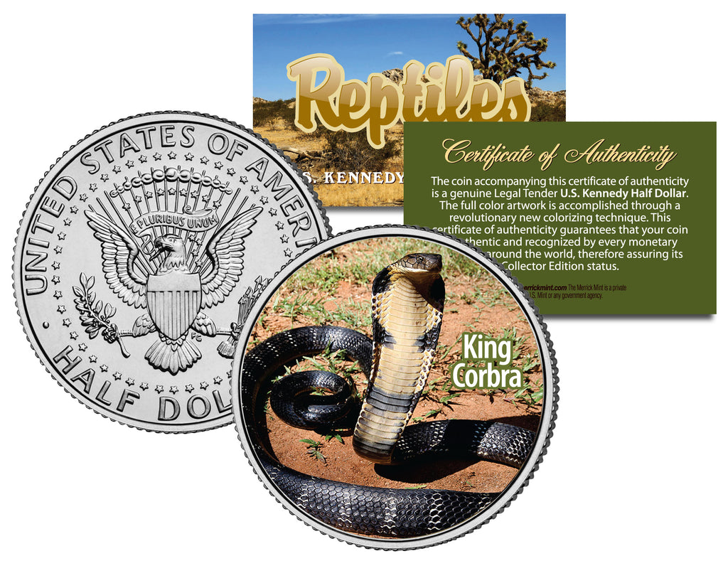 This COLLECTIBLE REPTILES SERIES – KING COBRA coin is a treasured collectible, combining the popularity of reptiles with coin collecting. Here is your chance to own a beautifully colorized JFK Kennedy Half Dollar U.S. Coin. This high-quality genuine Legal Tender U.S. coin has been colorized using a unique painstaking multicolor authentic process. Colorizing coins involves the unique application of special inks directly to the surface of a coin that achieves a level of detail, color saturation, and durability that is #1 in the coin industry. The result is an everlasting colorized coin collectible of ultra-high quality. Each coin comes in a premium coin capsule with a Certificate of Authenticity.