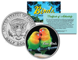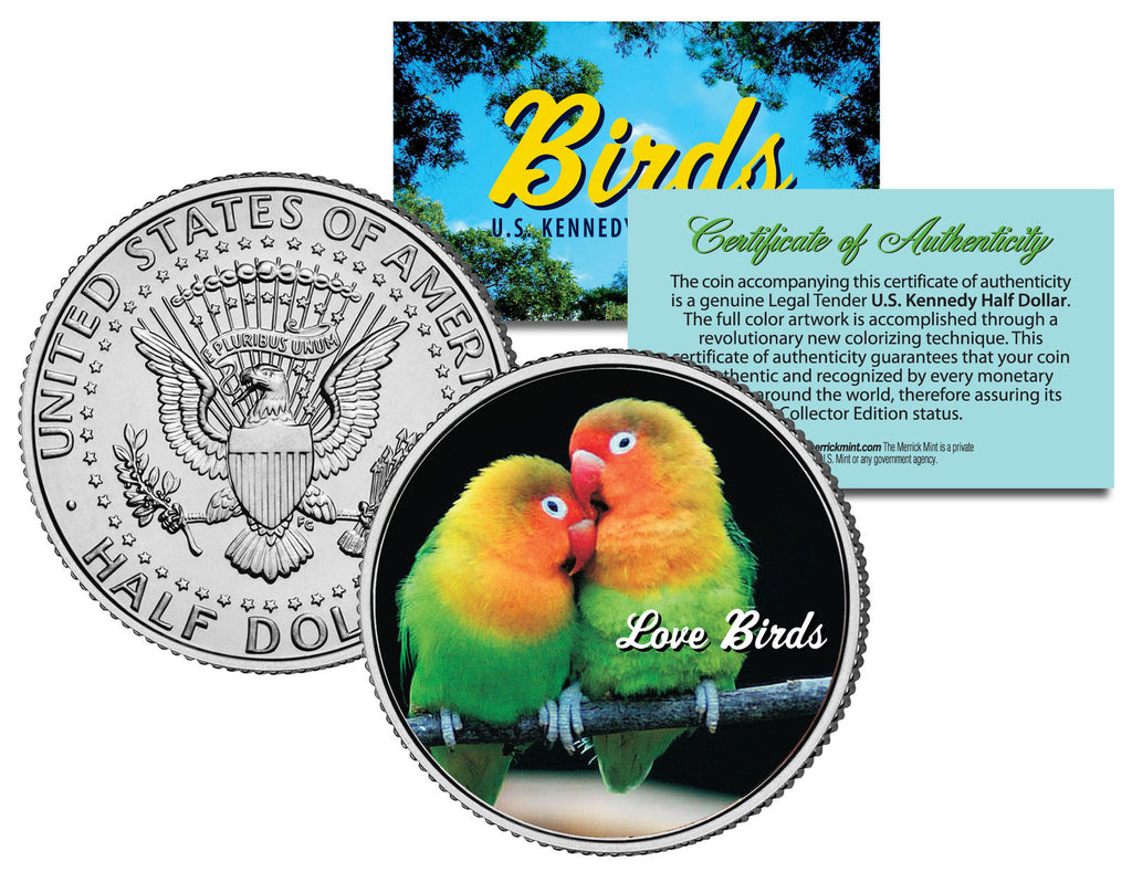 This COLLECTIBLE BIRDS SERIES – LOVE BIRDS coin is a treasured collectible, combining the popularity of birds with coin collecting. Here is your chance to own a beautifully colorized JFK Kennedy Half Dollar U.S. Coin. This high-quality genuine Legal Tender U.S. coin has been colorized using a unique painstaking multicolor authentic process by the Merrick Mint. Colorizing coins involves the unique application of special inks directly to the surface of a coin that achieves a level of detail, color saturation, and durability that is #1 in the coin industry. The result is an everlasting colorized coin collectible of ultra-high quality. Each coin comes in a premium coin capsule with a Certificate of Authenticity to guaranty that your coin is authentic and recognized by every monetary authority around the world, assuring its Collector Edition status. The Kennedy half dollar is a U.S. fifty cent coin with coin year and mint marks chosen at random.