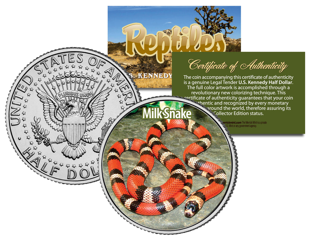 This COLLECTIBLE REPTILES SERIES – MILK SNAKE coin is a treasured collectible, combining the popularity of reptiles with coin collecting. Here is your chance to own a beautifully colorized JFK Kennedy Half Dollar U.S. Coin. This high-quality genuine Legal Tender U.S. coin has been colorized using a unique painstaking multicolor authentic process. Colorizing coins involves the unique application of special inks directly to the surface of a coin that achieves a level of detail, color saturation, and durability that is #1 in the coin industry. The result is an everlasting colorized coin collectible of ultra-high quality. Each coin comes in a premium coin capsule with a Certificate of Authenticity.