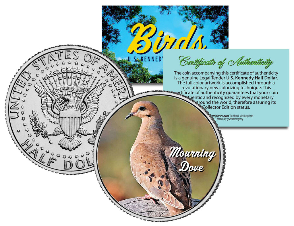 This COLLECTIBLE BIRDS SERIES – MOURNING DOVE coin is a treasured collectible, combining the popularity of birds with coin collecting. Here is your chance to own a beautifully colorized JFK Kennedy Half Dollar U.S. Coin. This high-quality genuine Legal Tender U.S. coin has been colorized using a unique painstaking multicolor authentic process by the Merrick Mint. Colorizing coins involves the unique application of special inks directly to the surface of a coin that achieves a level of detail, color saturation, and durability that is #1 in the coin industry. The result is an everlasting colorized coin collectible of ultra-high quality. Each coin comes in a premium coin capsule with a Certificate of Authenticity to guaranty that your coin is authentic and recognized by every monetary authority around the world, assuring its Collector Edition status. The Kennedy half dollar is a U.S. fifty cent coin with coin year and mint marks chosen at random.