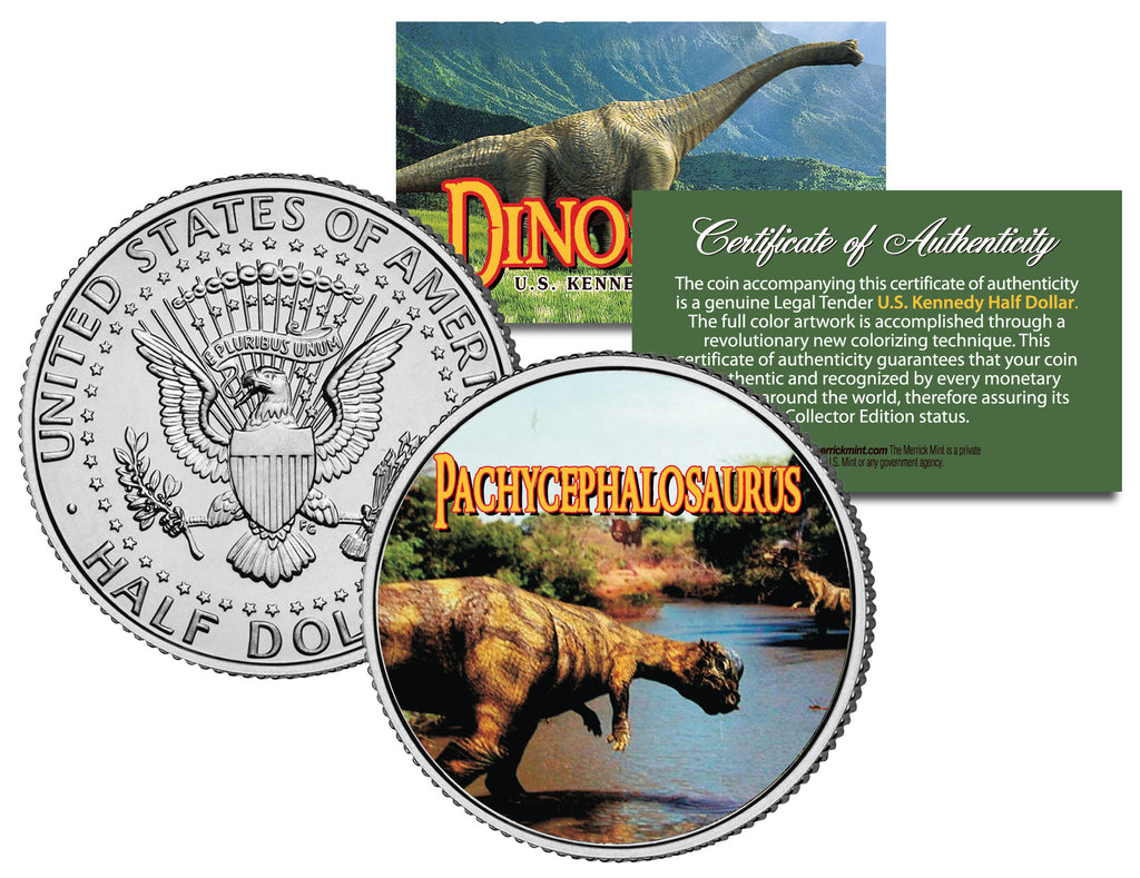 This COLLECTIBLE DINOSAURS SERIES – PACHYCEPHALOSAURUS coin is a treasured collectible, combining the popularity of dinosaurs with coin collecting. Here is your chance to own a beautifully colorized JFK Kennedy Half Dollar U.S. Coin. This high-quality genuine Legal Tender U.S. coin has been colorized using a unique painstaking multicolor authentic process. Colorizing coins involves the unique application of special inks directly to the surface of a coin that achieves a level of detail, color saturation, and durability that is #1 in the coin industry. The result is an everlasting colorized coin collectible of ultra-high quality. Each coin comes in a premium coin capsule with a Certificate of Authenticity to guaranty that your coin is authentic and recognized by every monetary authority around the world, assuring its Collector Edition status. Pachycephalosaurus is a genus of pachycephalosaurid dinosaur that lived during the Late Cretaceous Period of what is now North America.