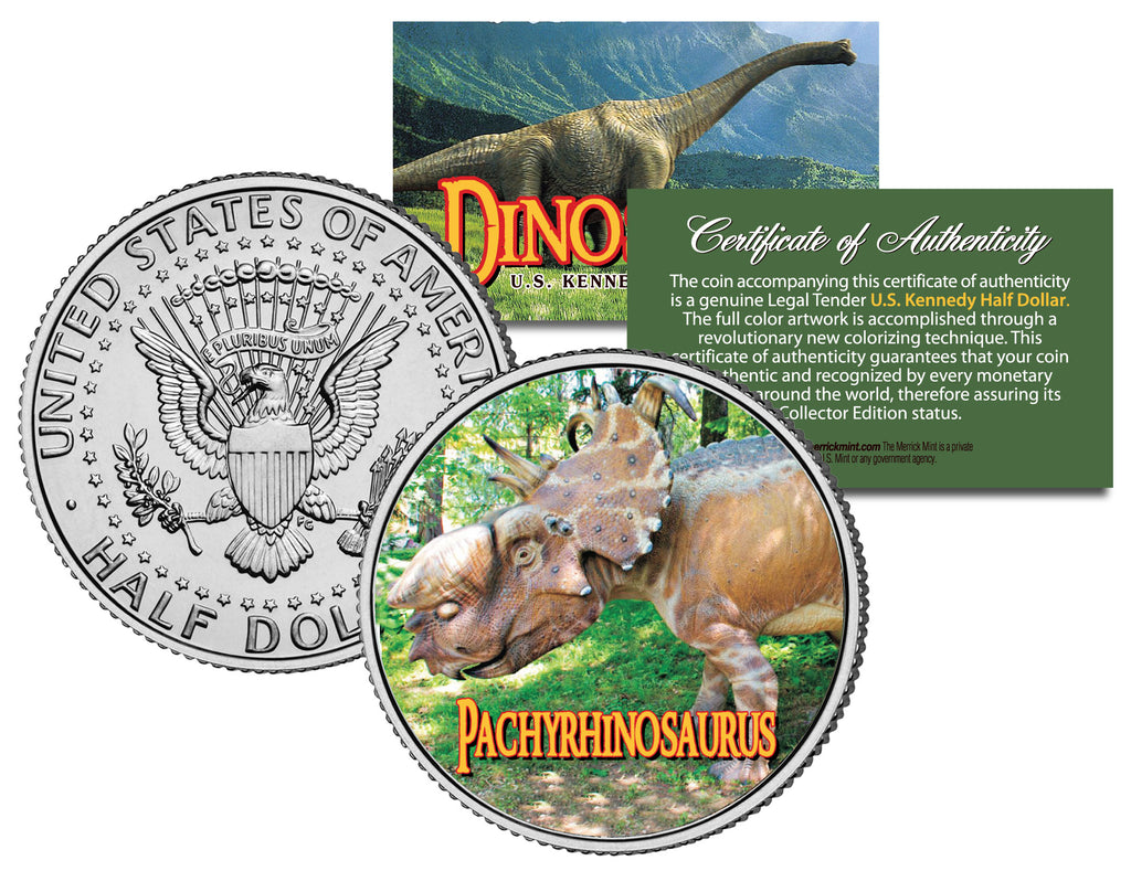 This COLLECTIBLE DINOSAURS SERIES – PACHYRHINOSAURUS coin is a treasured collectible, combining the popularity of dinosaurs with coin collecting. Here is your chance to own a beautifully colorized JFK Kennedy Half Dollar U.S. Coin. This high-quality genuine Legal Tender U.S. coin has been colorized using a unique painstaking multicolor authentic process. Colorizing coins involves the unique application of special inks directly to the surface of a coin that achieves a level of detail, color saturation, and durability that is #1 in the coin industry. The result is an everlasting colorized coin collectible of ultra-high quality. Each coin comes in a premium coin capsule with a Certificate of Authenticity to guaranty that your coin is authentic and recognized by every monetary authority around the world, assuring its Collector Edition status. Pachyrhinosaurus is a genus of centrosaurine ceratopsid dinosaurs that lived during the Late Cretaceous Period of what is now North America.