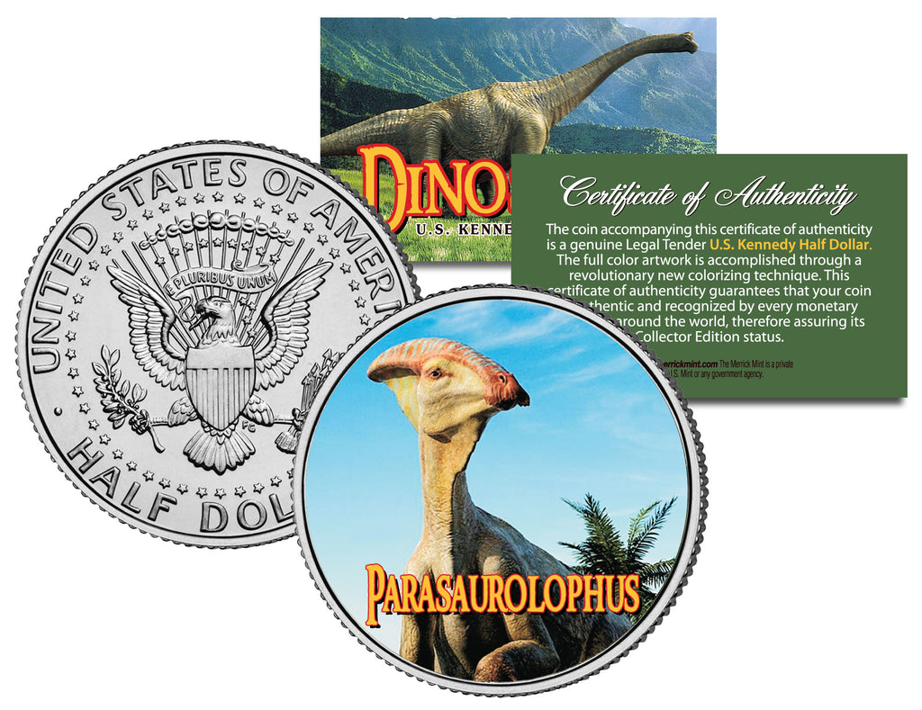 This COLLECTIBLE DINOSAURS SERIES – PARASAUROLOPHUS coin is a treasured collectible, combining the popularity of dinosaurs with coin collecting. Here is your chance to own a beautifully colorized JFK Kennedy Half Dollar U.S. Coin. This high-quality genuine Legal Tender U.S. coin has been colorized using a unique painstaking multicolor authentic process. Colorizing coins involves the unique application of special inks directly to the surface of a coin that achieves a level of detail, color saturation, and durability that is #1 in the coin industry. The result is an everlasting colorized coin collectible of ultra-high quality. Each coin comes in a premium coin capsule with a Certificate of Authenticity to guaranty that your coin is authentic and recognized by every monetary authority around the world, assuring its Collector Edition status. Parasaurolophus is a genus of ornithopod dinosaur that lived in what is now North America during the Late Cretaceous Period, about 76.5–73 million years ago.