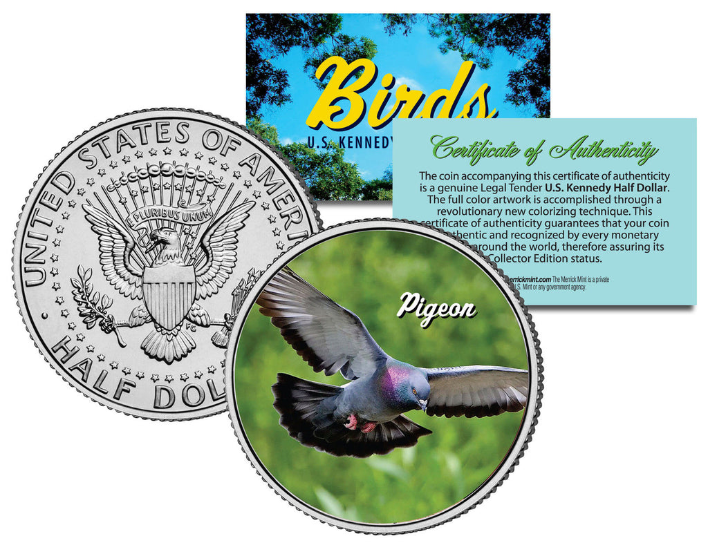 This COLLECTIBLE BIRDS SERIES – PIGEON coin is a treasured collectible, combining the popularity of birds with coin collecting. Here is your chance to own a beautifully colorized JFK Kennedy Half Dollar U.S. Coin. This high-quality genuine Legal Tender U.S. coin has been colorized using a unique painstaking multicolor authentic process by the Merrick Mint. Colorizing coins involves the unique application of special inks directly to the surface of a coin that achieves a level of detail, color saturation, and durability that is #1 in the coin industry. The result is an everlasting colorized coin collectible of ultra-high quality. Each coin comes in a premium coin capsule with a Certificate of Authenticity to guaranty that your coin is authentic and recognized by every monetary authority around the world, assuring its Collector Edition status. The Kennedy half dollar is a U.S. fifty cent coin with coin year and mint marks chosen at random.