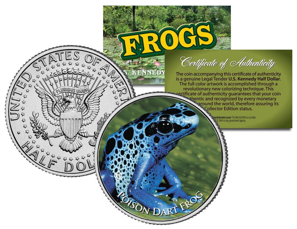 This COLLECTIBLE FROGS SERIES – POISON DART FROG coin is a treasured collectible, combining the popularity of frog collecting with coin collecting. Here is your chance to own a beautifully colorized JFK Kennedy Half Dollar U.S. Coin. This high-quality genuine Legal Tender U.S. coin has been colorized using a unique painstaking multicolor authentic process. Colorizing coins involves the unique application of special inks directly to the surface of a coin that achieves a level of detail, color saturation, and durability that is #1 in the coin industry. The result is an everlasting colorized coin collectible of ultra-high quality. Each coin comes in a premium coin capsule with a Certificate of Authenticity.