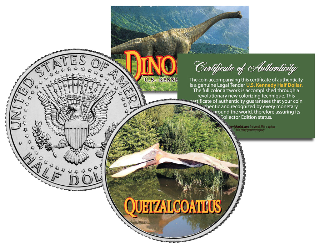 This COLLECTIBLE DINOSAURS SERIES – QUETZALCOATLUS coin is a treasured collectible, combining the popularity of dinosaurs with coin collecting. Here is your chance to own a beautifully colorized JFK Kennedy Half Dollar U.S. Coin. This high-quality genuine Legal Tender U.S. coin has been colorized using a unique painstaking multicolor authentic process. Colorizing coins involves the unique application of special inks directly to the surface of a coin that achieves a level of detail, color saturation, and durability that is #1 in the coin industry. The result is an everlasting colorized coin collectible of ultra-high quality. Each coin comes in a premium coin capsule with a Certificate of Authenticity to guaranty that your coin is authentic and recognized by every monetary authority around the world, assuring its Collector Edition status. Quetzalcoatlus was a pterodactyloid pterosaur that lived during the Late Cretaceous Period of what is now North America and was one of the largest known flying animals of all time.