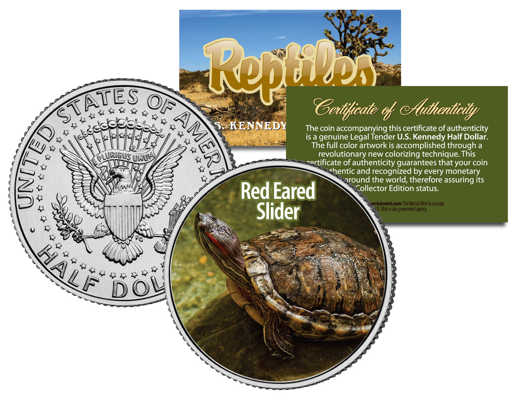 This COLLECTIBLE REPTILES SERIES – RED EARED SLIDER coin is a treasured collectible, combining the popularity of reptiles with coin collecting. Here is your chance to own a beautifully colorized JFK Kennedy Half Dollar U.S. Coin. This high-quality genuine Legal Tender U.S. coin has been colorized using a unique painstaking multicolor authentic process. Colorizing coins involves the unique application of special inks directly to the surface of a coin that achieves a level of detail, color saturation, and durability that is #1 in the coin industry. The result is an everlasting colorized coin collectible of ultra-high quality. Each coin comes in a premium coin capsule with a Certificate of Authenticity.
