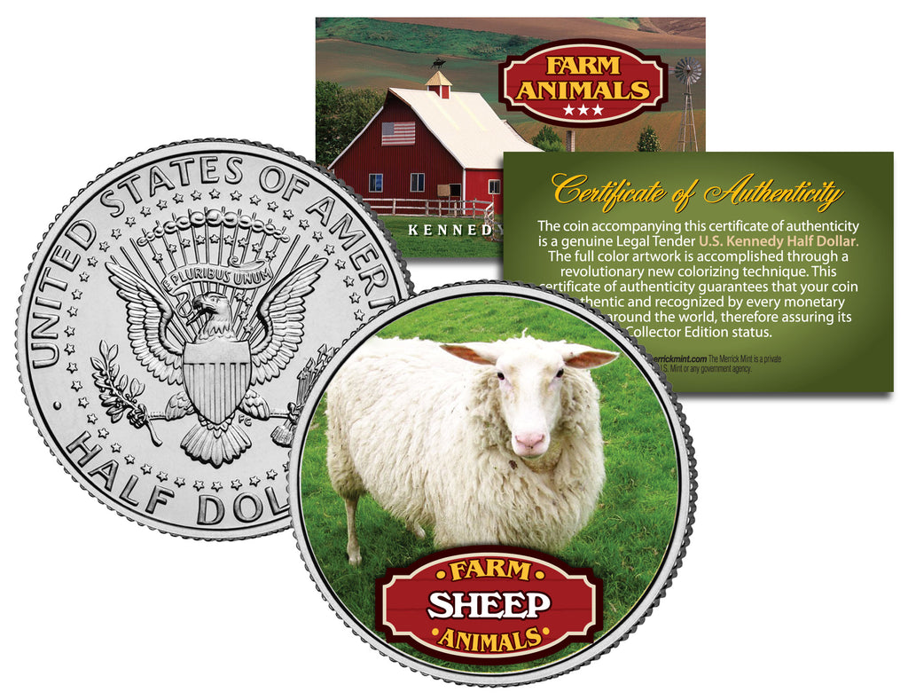 This COLLECTIBLE FARM ANIMALS SERIES – SHEEP coin is a treasured collectible, combining the popularity of Farm Animals with coin collecting. Here is your chance to own a beautifully colorized JFK Kennedy Half Dollar U.S. Coin. This high-quality genuine Legal Tender U.S. coin has been colorized using a unique painstaking multicolor authentic process. Colorizing coins involves the unique application of special inks directly to the surface of a coin that achieves a level of detail, color saturation, and durability that is #1 in the coin industry. The result is an everlasting colorized coin collectible of ultra-high quality. Each coin comes in a premium coin capsule with a Certificate of Authenticity to guaranty that your coin is authentic and recognized by every monetary authority around the world, assuring its Collector Edition status. Sheep are primarily raised on farms for their meat, milk, or wool.
