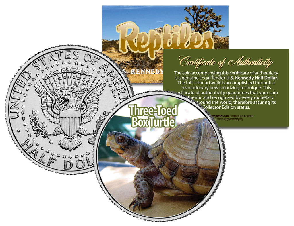 This COLLECTIBLE REPTILES SERIES – THREE-TOED BOX TURTLE coin is a treasured collectible, combining the popularity of reptiles with coin collecting. Here is your chance to own a beautifully colorized JFK Kennedy Half Dollar U.S. Coin. This high-quality genuine Legal Tender U.S. coin has been colorized using a unique painstaking multicolor authentic process. Colorizing coins involves the unique application of special inks directly to the surface of a coin that achieves a level of detail, color saturation, and durability that is #1 in the coin industry. The result is an everlasting colorized coin collectible of ultra-high quality. Each coin comes in a premium coin capsule with a Certificate of Authenticity.