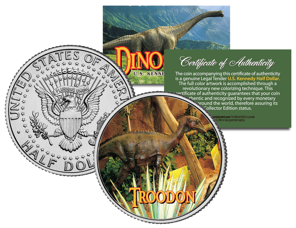 This COLLECTIBLE DINOSAURS SERIES – TROODON coin is a treasured collectible, combining the popularity of dinosaurs with coin collecting. Here is your chance to own a beautifully colorized JFK Kennedy Half Dollar U.S. Coin. This high-quality genuine Legal Tender U.S. coin has been colorized using a unique painstaking multicolor authentic process. Colorizing coins involves the unique application of special inks directly to the surface of a coin that achieves a level of detail, color saturation, and durability that is #1 in the coin industry. The result is an everlasting colorized coin collectible of ultra-high quality. Each coin comes in a premium coin capsule with a Certificate of Authenticity to guaranty that your coin is authentic and recognized by every monetary authority around the world, assuring its Collector Edition status. Troodon is a genus of relatively small, bird-like dinosaurs known definitively from the Campanian age of the Cretaceous period.