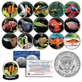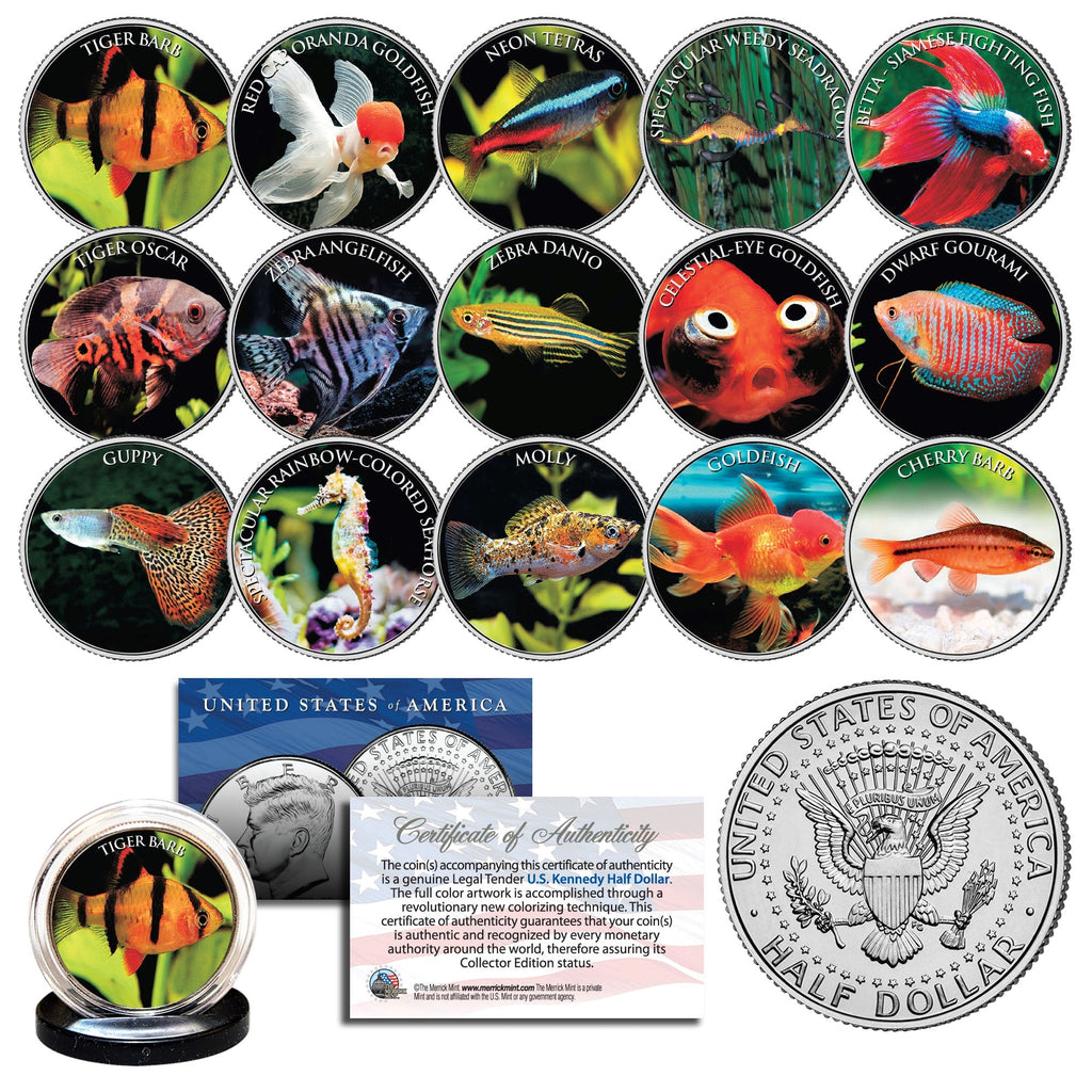 This complete 15-coin set is a treasured collectible. Here is your chance to own beautifully colorized JFK Kennedy Half Dollar U.S. Coins of the most popular Tropical Fish. These high-quality genuine Legal Tender U.S. coins have been colorized using a unique painstaking multicolor authentic process. Colorizing coins involves the unique application of special inks directly to the surface of a coin that achieves a level of detail, color saturation, and durability that is #1 in the coin industry. The result is an everlasting colorized coin collectible of ultra-high quality. The set comes with a Certificate of Authenticity to guaranty that your coins are authentic and recognized by every monetary authority around the world, assuring its Collector Edition status. Each coin comes in a premium coin capsule.