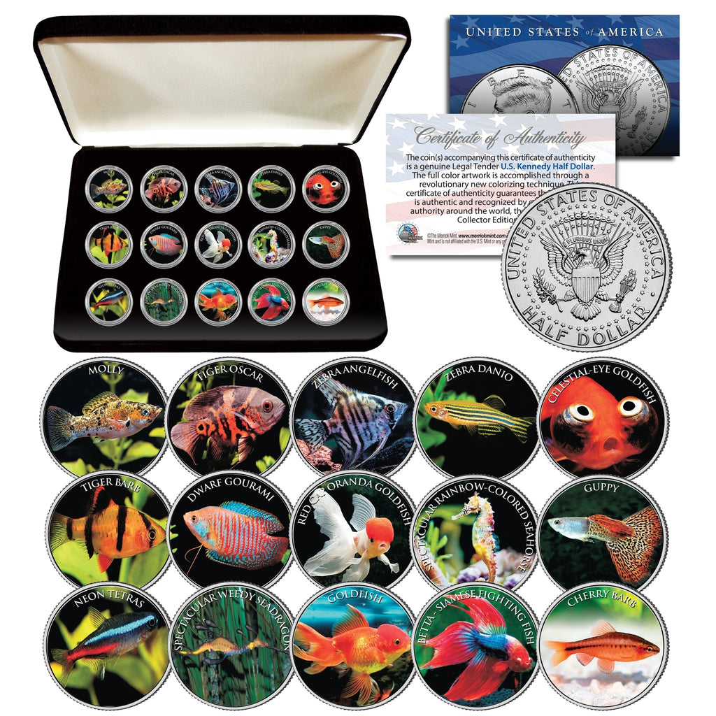 This complete 15-coin set is a treasured collectible. Here is your chance to own beautifully colorized JFK Kennedy Half Dollar U.S. Coins of the most popular Tropical Fish. These high-quality genuine Legal Tender U.S. coins have been colorized using a unique painstaking multicolor authentic process. Colorizing coins involves the unique application of special inks directly to the surface of a coin that achieves a level of detail, color saturation, and durability that is #1 in the coin industry. The result is an everlasting colorized coin collectible of ultra-high quality. The set comes with a Certificate of Authenticity to guaranty that your coins are authentic and recognized by every monetary authority around the world, assuring its Collector Edition status. Each coin comes in a premium coin capsule and all 15 coins come in a high-quality black metal felt display box.