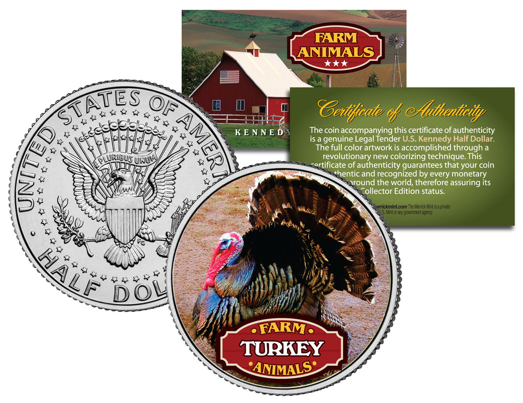 This COLLECTIBLE FARM ANIMALS SERIES – TURKEY coin is a treasured collectible, combining the popularity of Farm Animals with coin collecting. Here is your chance to own a beautifully colorized JFK Kennedy Half Dollar U.S. Coin. This high-quality genuine Legal Tender U.S. coin has been colorized using a unique painstaking multicolor authentic process. Colorizing coins involves the unique application of special inks directly to the surface of a coin that achieves a level of detail, color saturation, and durability that is #1 in the coin industry. The result is an everlasting colorized coin collectible of ultra-high quality. Each coin comes in a premium coin capsule with a Certificate of Authenticity to guaranty that your coin is authentic and recognized by every monetary authority around the world, assuring its Collector Edition status. Turkeys are primarily raised by farmers for meat.