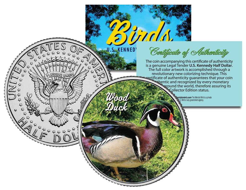 This COLLECTIBLE BIRDS SERIES – WOOD DUCK coin is a treasured collectible, combining the popularity of birds with coin collecting. Here is your chance to own a beautifully colorized JFK Kennedy Half Dollar U.S. Coin. This high-quality genuine Legal Tender U.S. coin has been colorized using a unique painstaking multicolor authentic process by the Merrick Mint. Colorizing coins involves the unique application of special inks directly to the surface of a coin that achieves a level of detail, color saturation, and durability that is #1 in the coin industry. The result is an everlasting colorized coin collectible of ultra-high quality. Each coin comes in a premium coin capsule with a Certificate of Authenticity to guaranty that your coin is authentic and recognized by every monetary authority around the world, assuring its Collector Edition status. The Kennedy half dollar is a U.S. fifty cent coin with coin year and mint marks chosen at random.