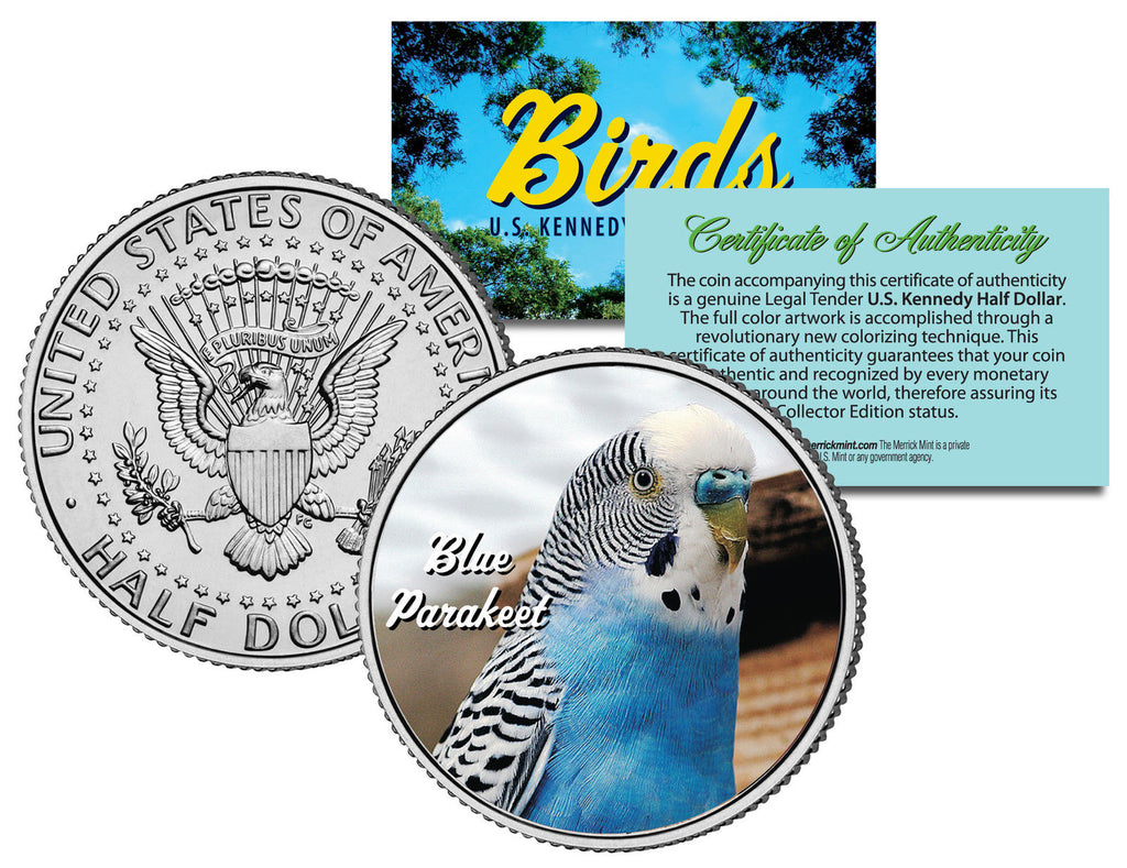 This COLLECTIBLE BIRDS SERIES – BLUE PARAKEET coin is a treasured collectible, combining the popularity of birds with coin collecting. Here is your chance to own a beautifully colorized JFK Kennedy Half Dollar U.S. Coin. This high-quality genuine Legal Tender U.S. coin has been colorized using a unique painstaking multicolor authentic process by the Merrick Mint. Colorizing coins involves the unique application of special inks directly to the surface of a coin that achieves a level of detail, color saturation, and durability that is #1 in the coin industry. The result is an everlasting colorized coin collectible of ultra-high quality. Each coin comes in a premium coin capsule with a Certificate of Authenticity to guaranty that your coin is authentic and recognized by every monetary authority around the world, assuring its Collector Edition status. The Kennedy half dollar is a U.S. fifty cent coin with coin year and mint marks chosen at random.