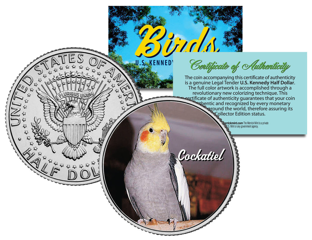 This COLLECTIBLE BIRDS SERIES – COCKATIEL coin is a treasured collectible, combining the popularity of birds with coin collecting. Here is your chance to own a beautifully colorized JFK Kennedy Half Dollar U.S. Coin. This high-quality genuine Legal Tender U.S. coin has been colorized using a unique painstaking multicolor authentic process by the Merrick Mint. Colorizing coins involves the unique application of special inks directly to the surface of a coin that achieves a level of detail, color saturation, and durability that is #1 in the coin industry. The result is an everlasting colorized coin collectible of ultra-high quality. Each coin comes in a premium coin capsule with a Certificate of Authenticity to guaranty that your coin is authentic and recognized by every monetary authority around the world, assuring its Collector Edition status. The Kennedy half dollar is a U.S. fifty cent coin with coin year and mint marks chosen at random.