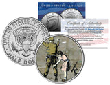 Here is your opportunity to own or to gift the BANKSY - GIRL FRISKING SOLDIER colorized JFK Kennedy Half Dollar U.S. Coin, which has been enhanced with a beautifully colorized image by the Merrick Mint. Each coin comes in a premium coin capsule with a full color Certificate of Authenticity to guarantee that your coin is authentic and recognized by every monetary authority around the world, assuring its Collector Edition status. This Legal Tender United States coin has been colorized with an application of special inks directly to the surface of the coin, using a unique and painstakingly multicolor coin process, which achieves a level of detail, color saturation, and durability that is #1 in the coin industry. The result is an everlasting colorized coin collectible of ultra-high quality.