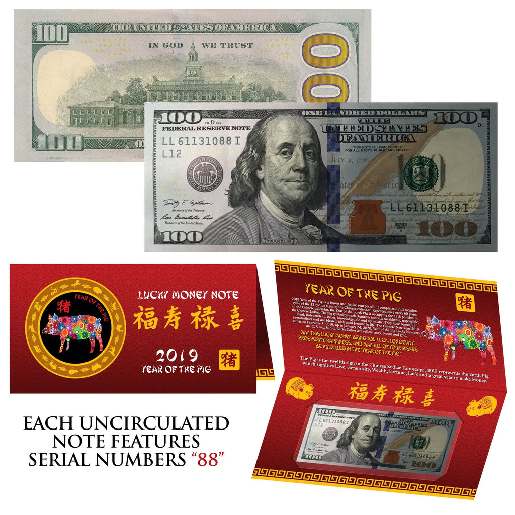 In celebration of the 2019 Year of the Pig Chinese Lunar New Year, we have announced the newest addition to its Lucky Money Collection…2019 Year of the Pig Lucky 8’s Serial Number Banknotes. The Year of the Pig 2019 product is designed with Decorative Chinese Symbolism and packaged in a Symbolic Red Folder adorned in Full-Color. Each folder contains an uncirculated Genuine Legal Tender United States Banknote.