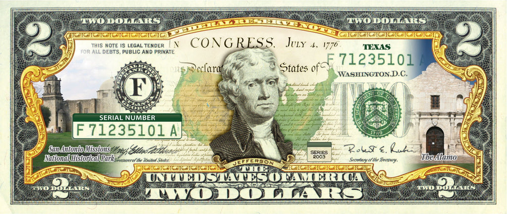 This TEXAS State uncirculated Two-Dollar Bill is Genuine Legal Tender of the United States, which has been enhanced with beautiful iconic images of the State. The colorized images are accomplished through a revolutionary new authentic & genuine colorization process pioneered by The Merrick Mint, creating a collectible work of art. Additionally, The Merrick Mint has applied three unique security features to the bill using a special C-Thru technology including: bell in the inkwell, the feather quill, and vertical ribbon. Included is a blue display portfolio plus a Certificate of Authenticity to guaranty that your bill is authentic and recognized by every monetary authority around the world, and assuring its Collector Edition status. Only genuine Legal Tender $2 United States Bills are used for this unique colorization process. Each $2 Bill is in FRESH, CRISP, UNCIRCULATED condition, and was directly removed from untouched wrapped Federal Reserve sealed packs. Former U.S. President Thomas Jefferson is featured on the obverse of the note, along with the special colorization overlay. The Signing of the Declaration of Independence by John Trumbull is featured on the reverse. It is the only U.S. Currency note that features two Presidents, John Adams and Thomas Jefferson, and it is one of the most rarely seen BILLS in circulation and actual use.
